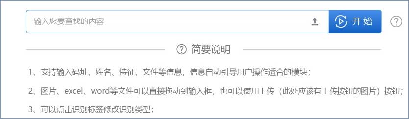 建設(shè)統(tǒng)一入口界面,實(shí)現(xiàn)用戶(hù)的多種輸入方式,包括但不限于各類(lèi)碼址、名稱(chēng)、地址、特征片段、數(shù)據(jù)文件、文檔文件等。支持通配符方式;支持中英文兩個(gè)語(yǔ)種的輸入支持和判斷,支持中英文混合輸入;支持多條信息或文件的輸入。